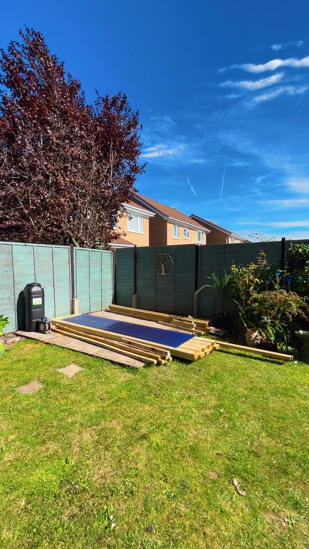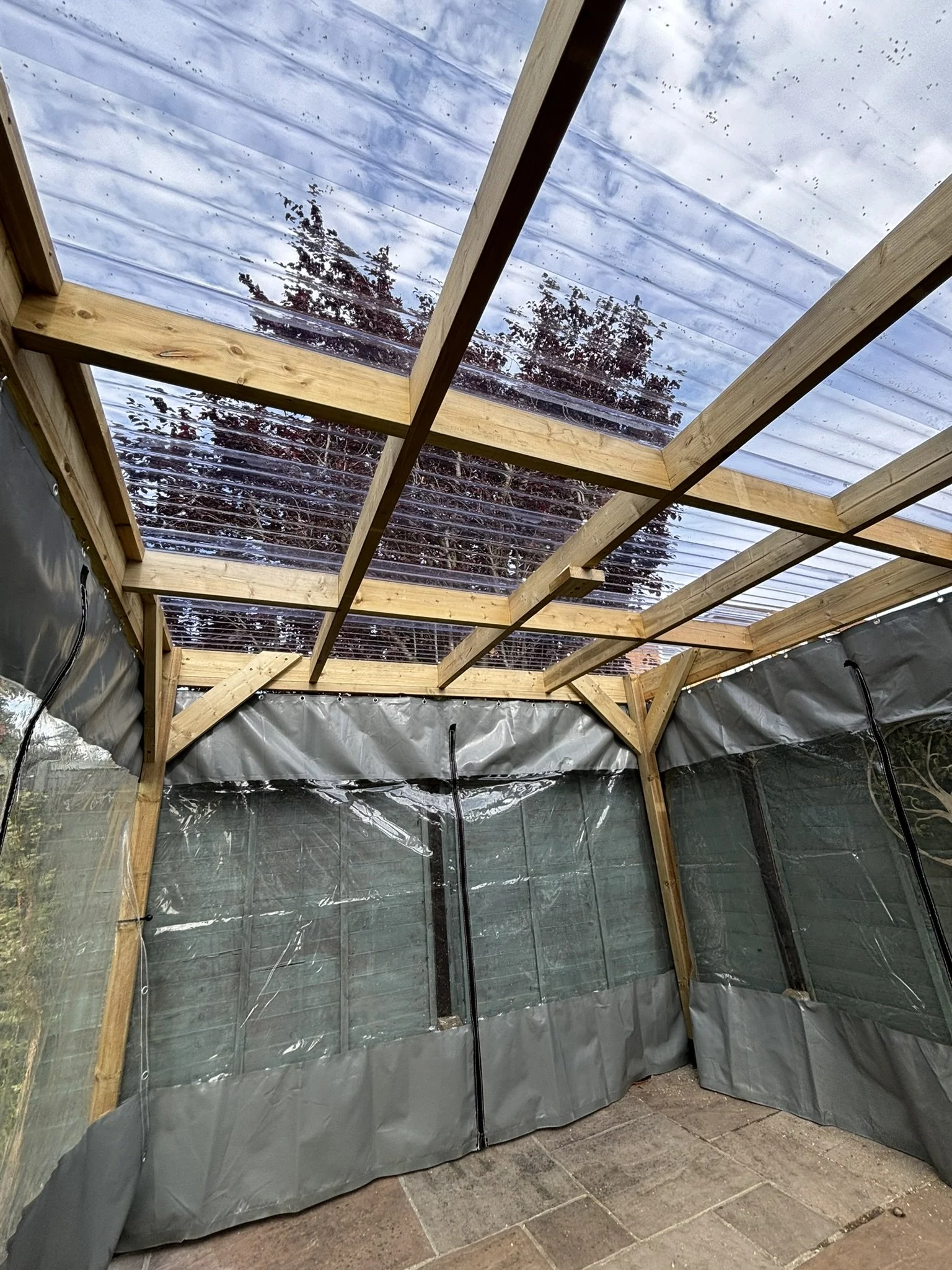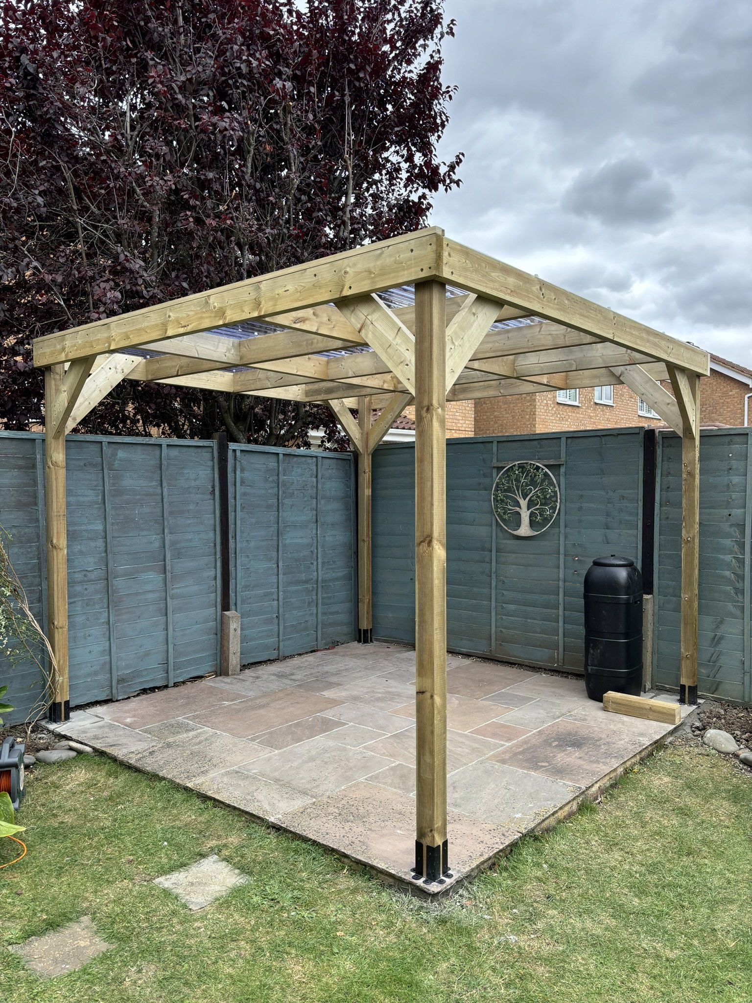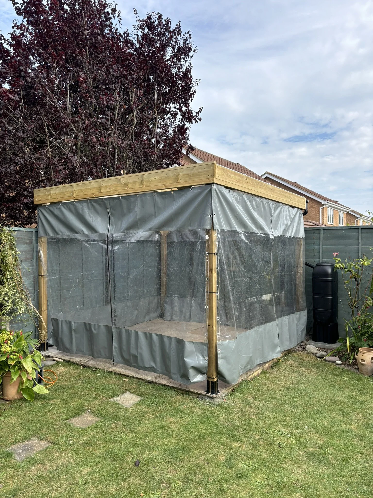 Construct garden pergola with corrugated roof, pergola side curtains, guttering with water butt.