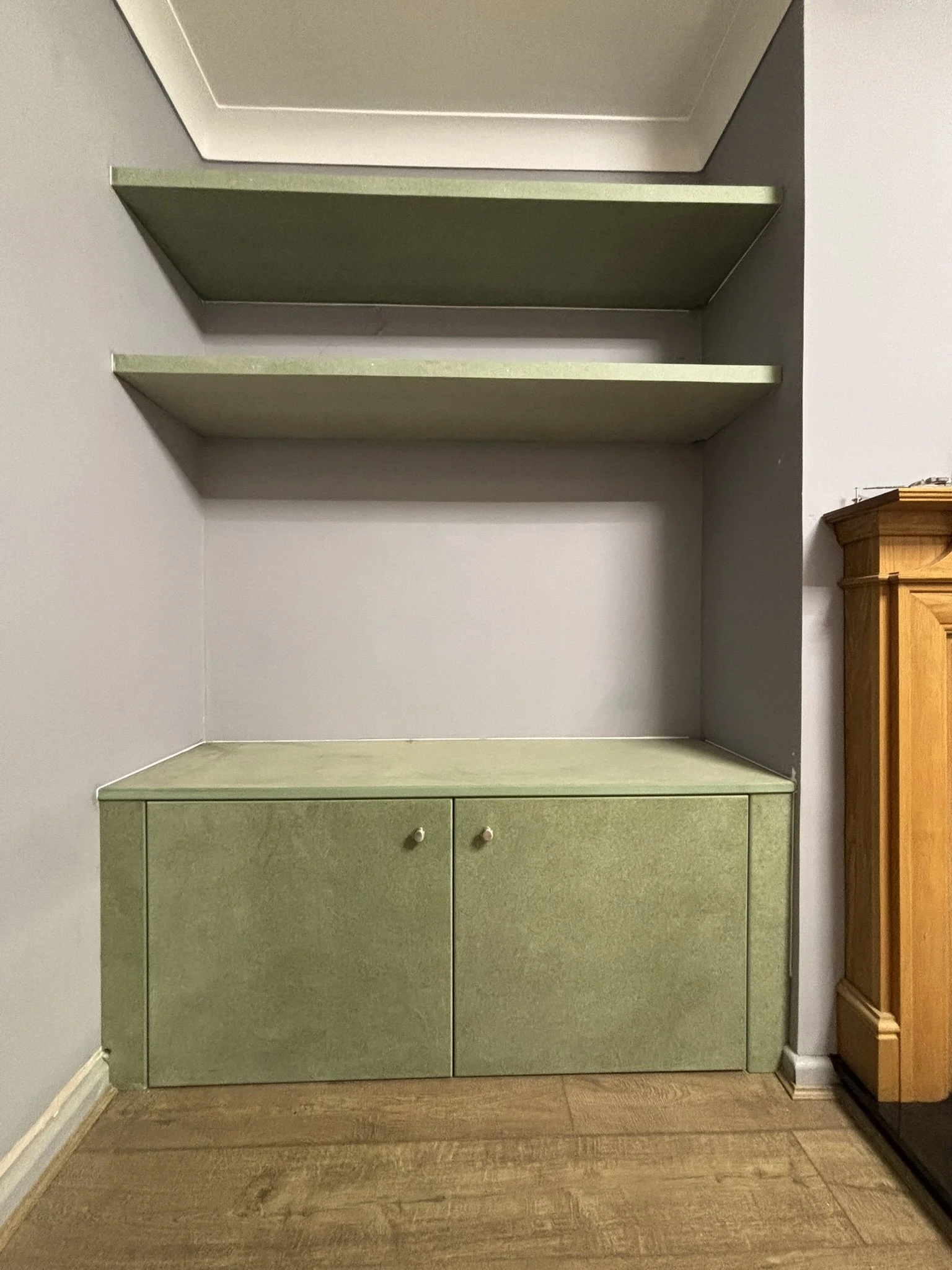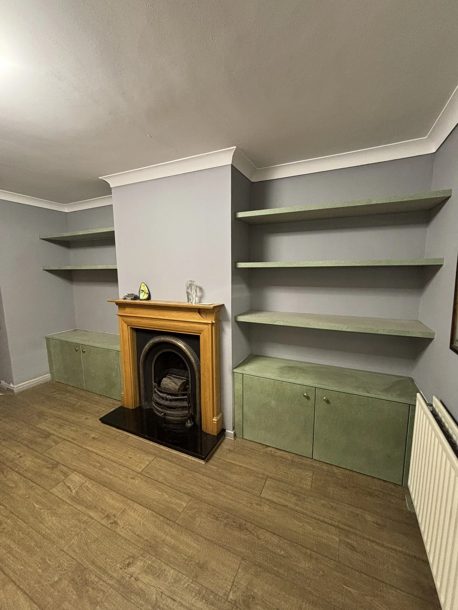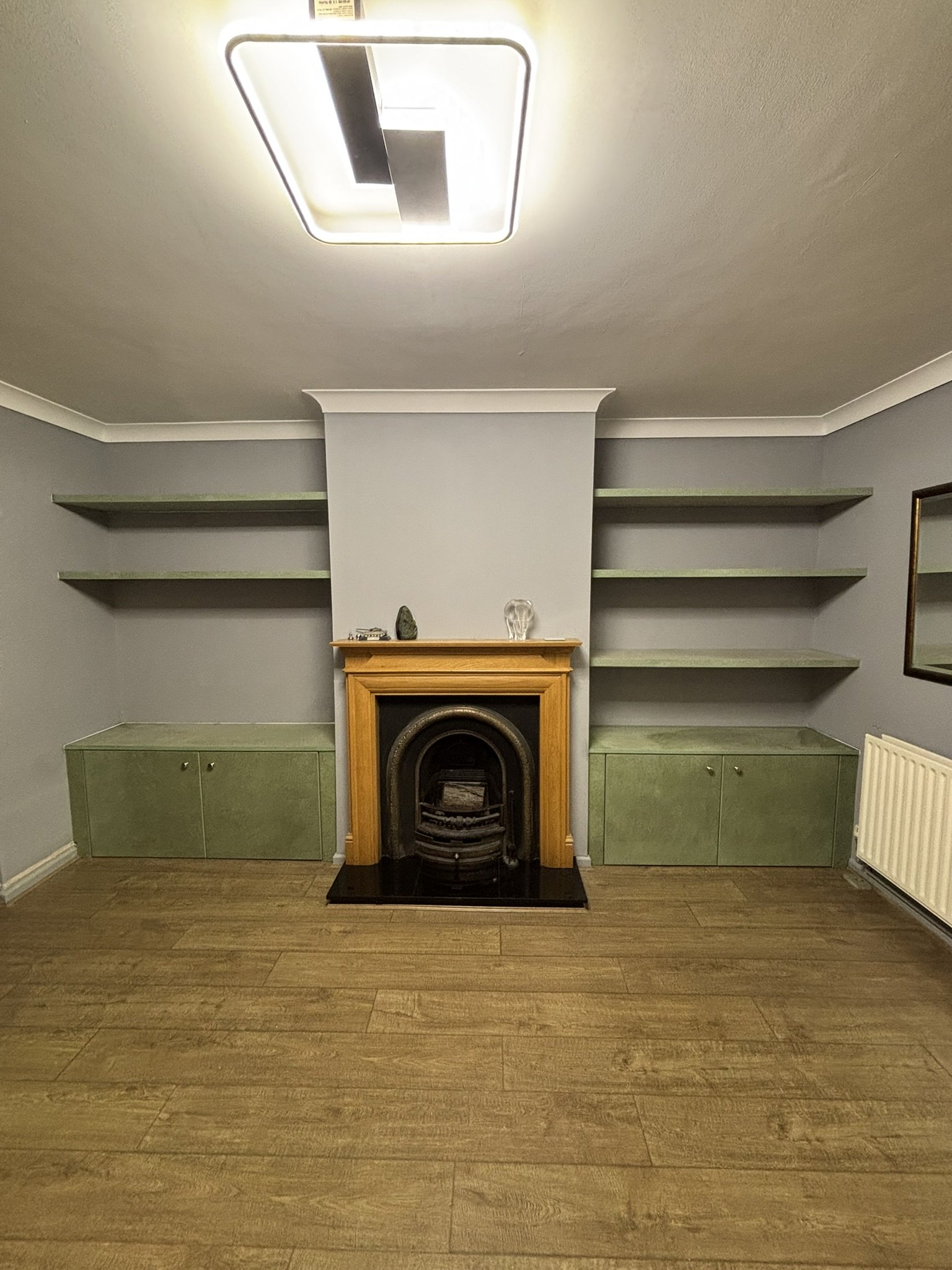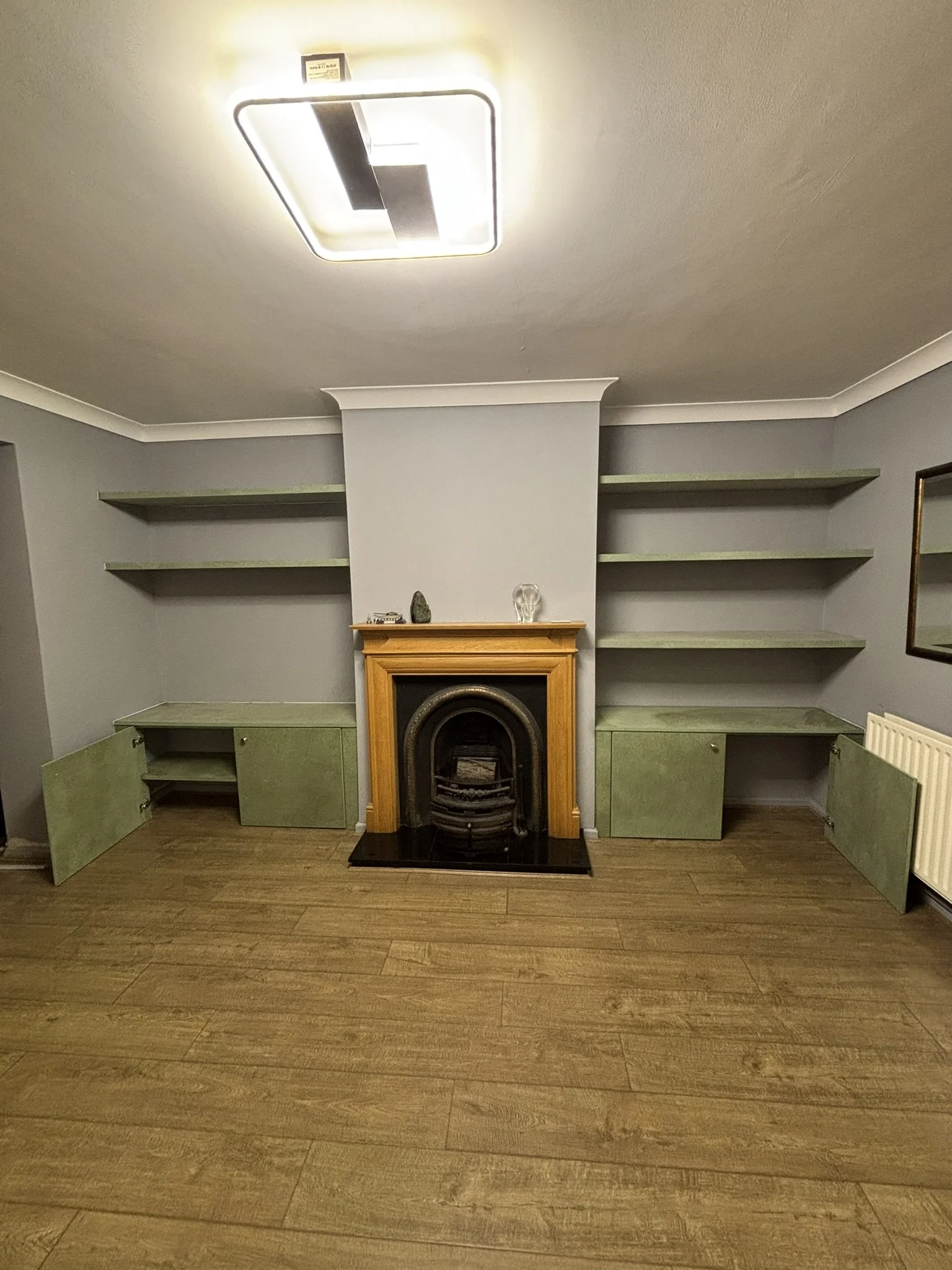 Construct moisture resistant MDF cabinets with Bullnose finish doors and floating shelves built in situ to house TV on the left.
