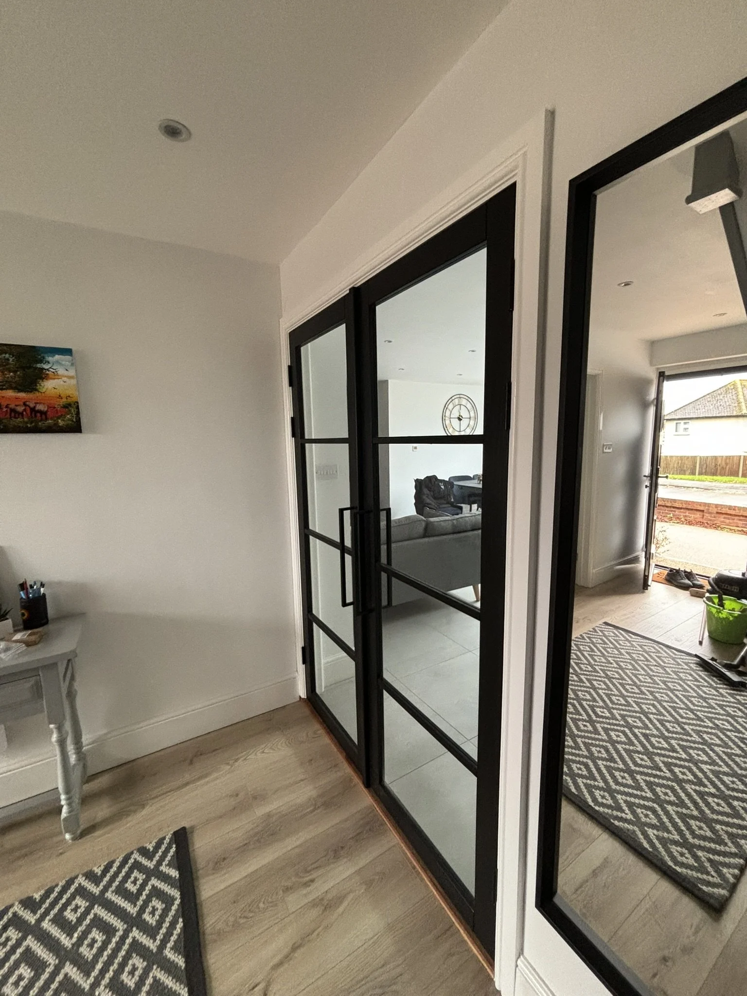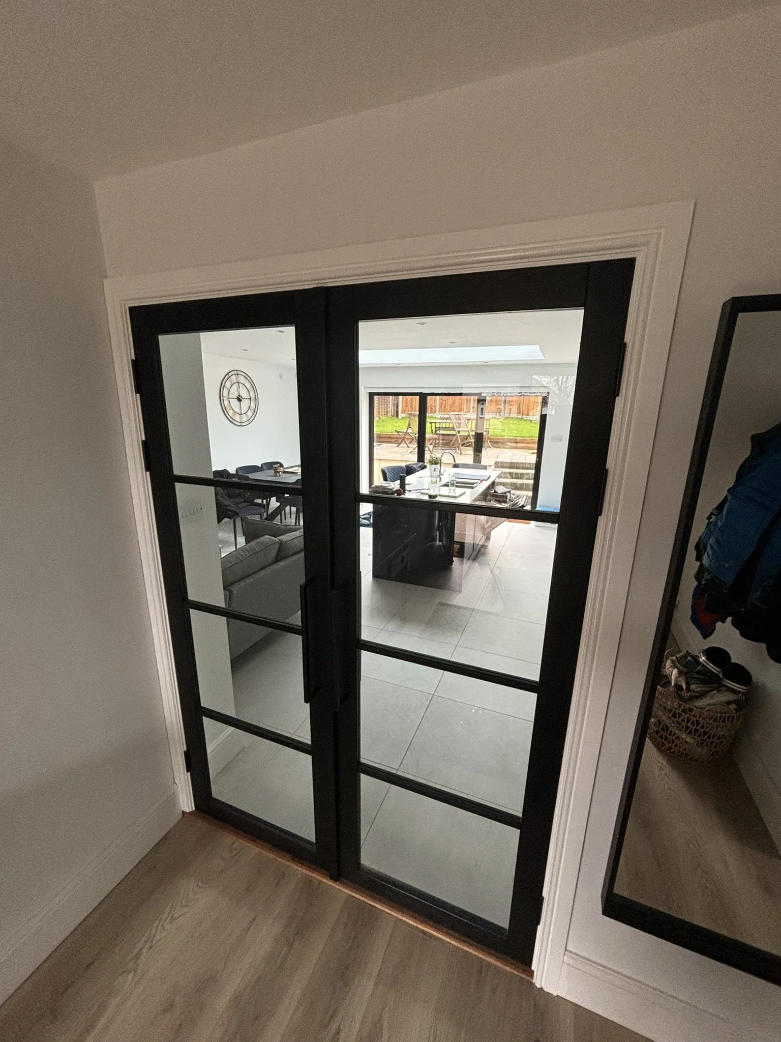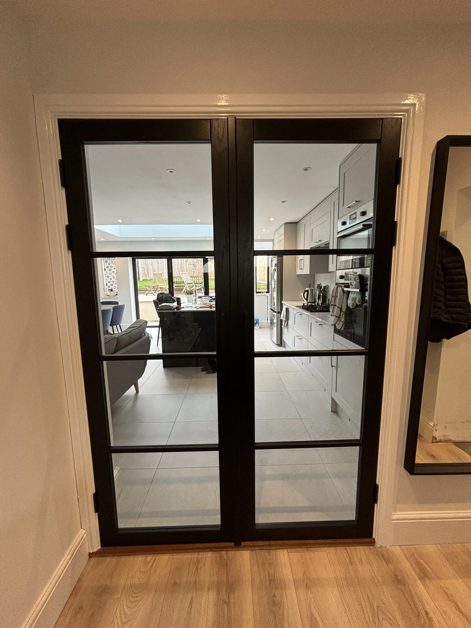 Oak Glass Panel Doors Works completed:New door liningOak glass panel double doorsIronmongery, skirting and architrave